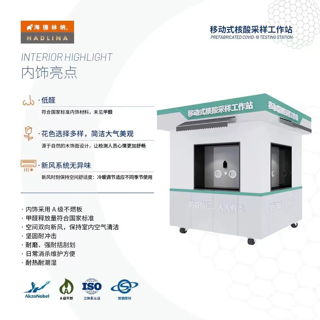 海德林納?移動(dòng)式核酸采樣工作站內(nèi)部配備了多功能空調(diào)、抗菌墻板、紫外線消毒系統(tǒng)、新風(fēng)系統(tǒng),空氣凈化等多種智能設(shè)備。最大程度保證防疫工作安全、改善工作人員核酸采樣工作環(huán)境、全面提升區(qū)域核酸檢測(cè)能力。